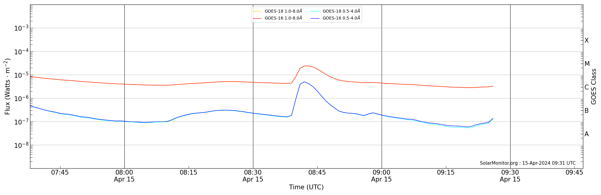 | 2024-04-15T08:38:00 | 08:42:00 | 08:47:00 | 27, 28 | 13634 | M2.4 | HEK : SSW Latest Events |