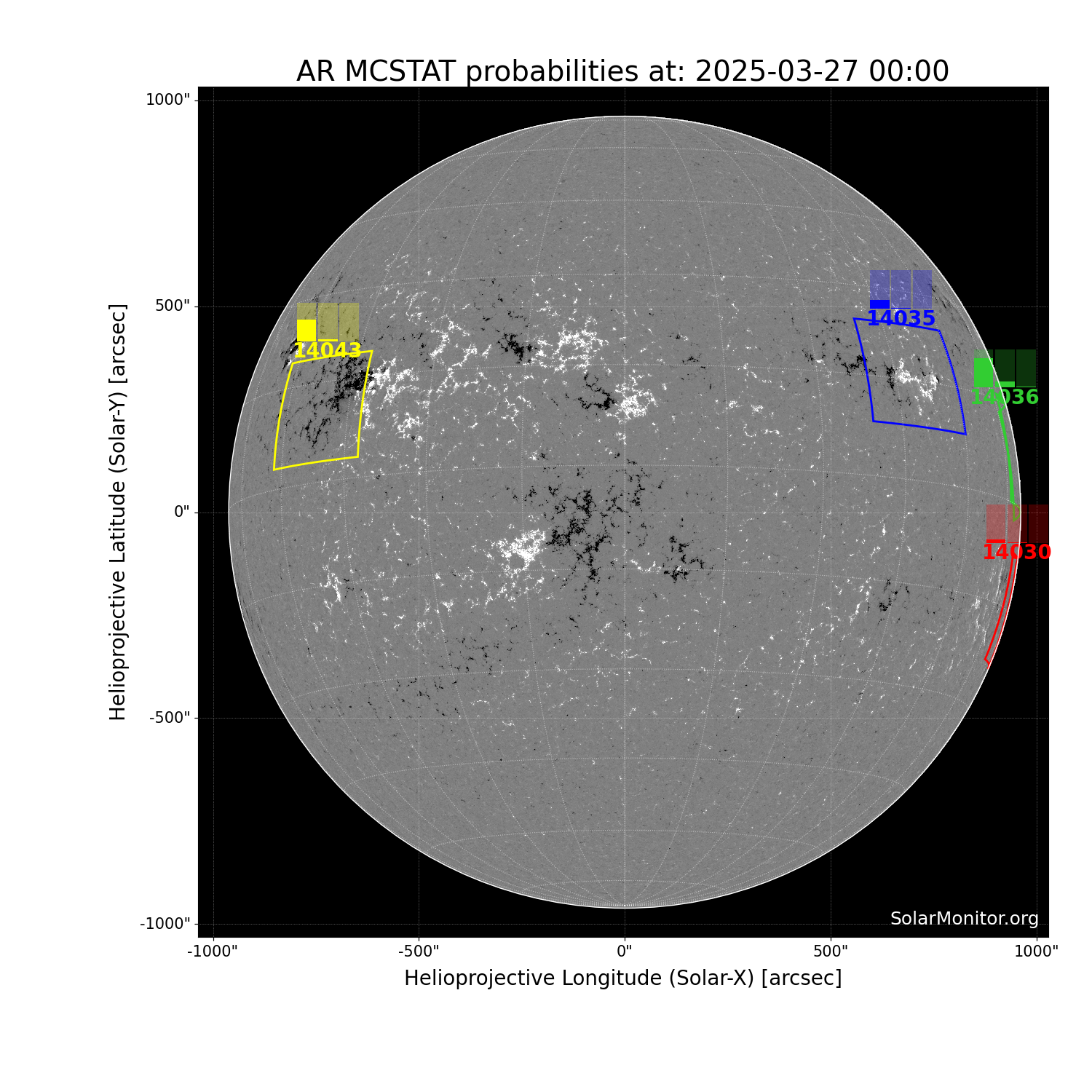SolarMonitor's flare prediction system's probabilities are calculated using the NOAA Space Weather Predicion Centre's McIntosh classifications. There are two methods, MCSTAT and MCEVOL, that use sunspot-group McIntosh classifications and Poisson statistics to calculate flaring probabilities valid for a 24-hr period starting at 00:00 UTC. The flaring probabilities are calculated using historical data from solar cycles 23 and 24 (1996-2019).