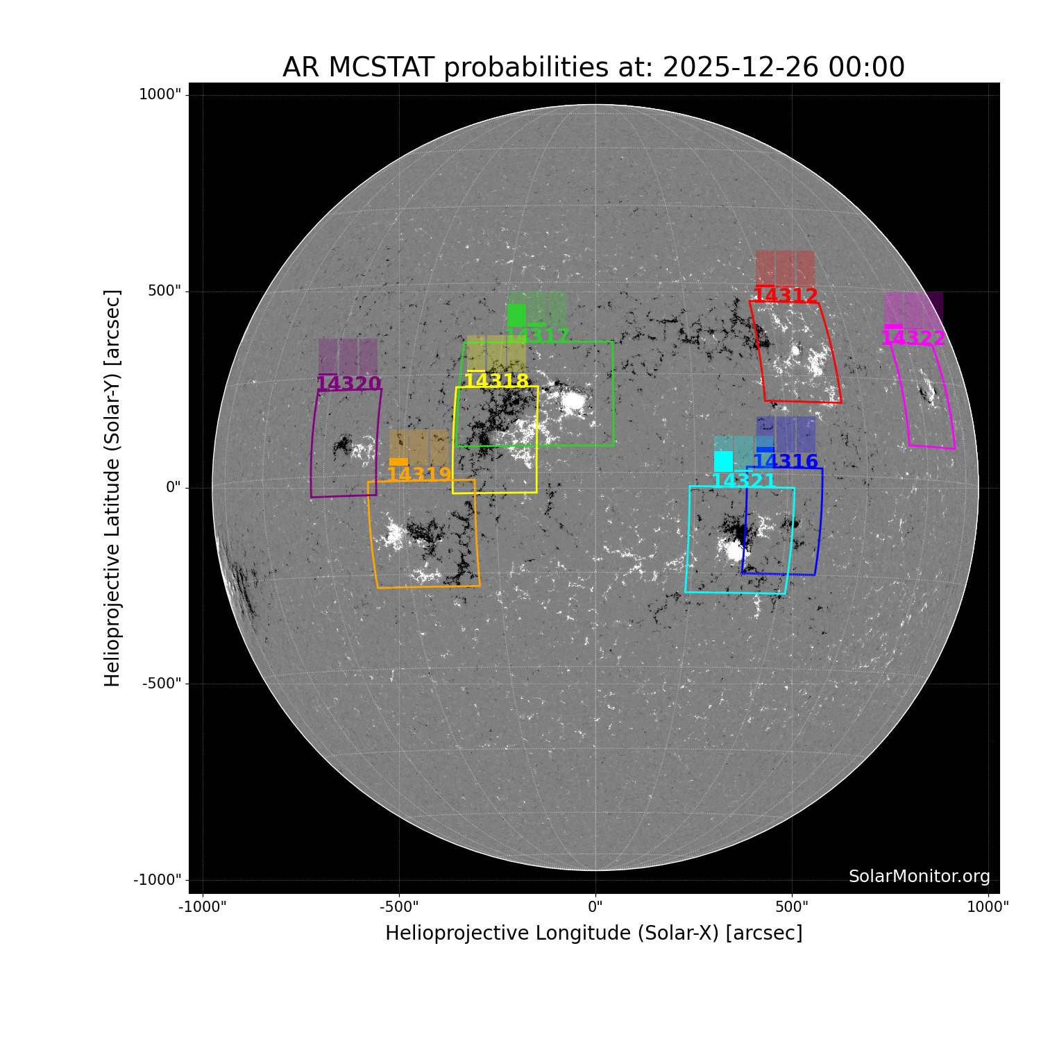SolarMonitor's flare prediction system's probabilities are calculated using the NOAA Space Weather Predicion Centre's McIntosh classifications. There are two methods, MCSTAT and MCEVOL, that use sunspot-group McIntosh classifications and Poisson statistics to calculate flaring probabilities valid for a 24-hr period starting at 00:00 UTC. The flaring probabilities are calculated using historical data from solar cycles 23 and 24 (1996-2019).